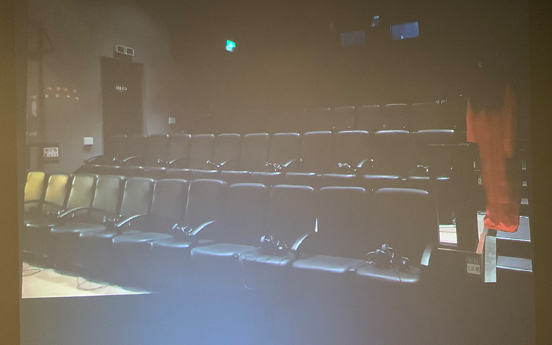会場内の様子は上の写真の通りです。これはスクリーンに投影されている会場内の様子を撮影したもので、12席の座席が4列で、計48席というキャパシティの映画館のようなスペースになっています。現在は新型コロナウイルス感染拡大防止対策として、1席ずつ空けて使用していますので1列あたり6名様までのご案内となっています。